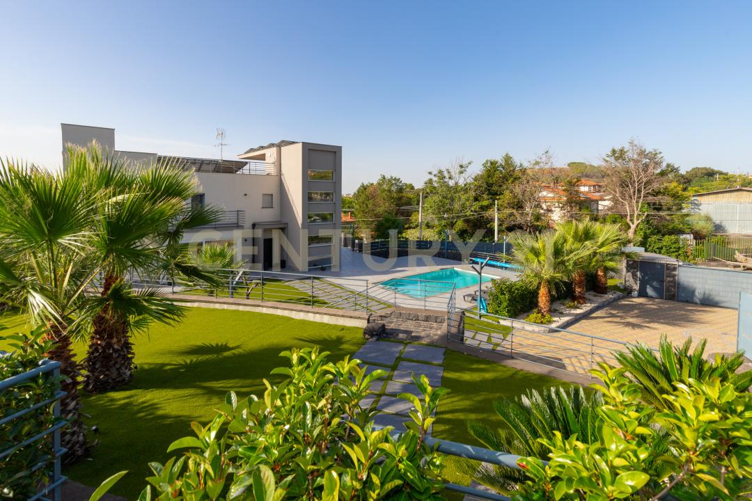 Piano Terra: Ampio open space con cucina moderna, zona breakfast con vista Etna e salone con area TV e armadio incassato a parete. Le grandi finestre con doppi vetri assicurano un'eccellente luminosità e isolamento termoacustico e vista sulla splendida Etna. Il piano include anche un bagno, una lavanderia con wc e una dispensa. L'illuminazione a led è incassata in soffitti decorativi di pregio e in stile moderno, mentre le luci sono gestite da un sistema domotico che controlla anche le tapparelle elettriche, con zanzariere integrate.